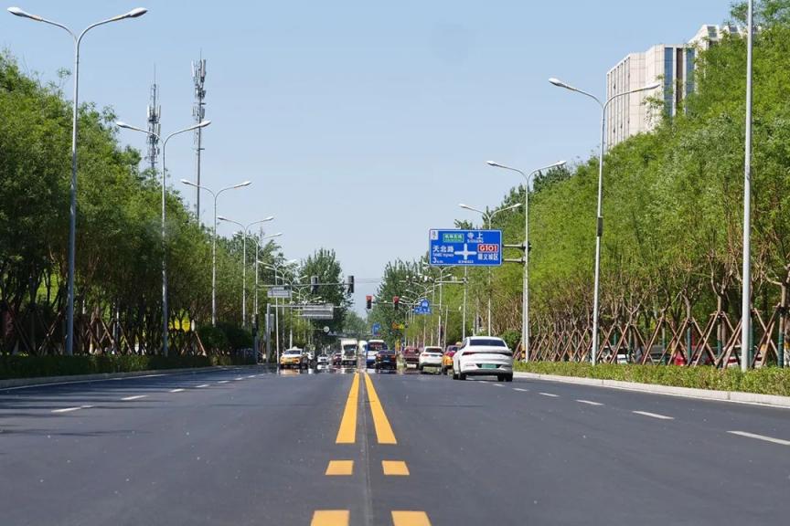 天北路(华谊南桥—安华街)全长6.3公里,沿线有首都国际会展中心、北京首都国际机场等。工程主要实施内容为道路工程、绿化工程、排水工程、交通工程、附属工程等。同时,道路沿线统一更新路灯、垃圾桶、指示牌等设施,将顺义元素融入其中,打造新的风景线。
