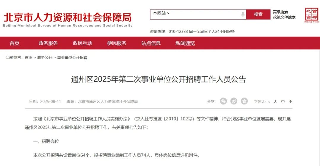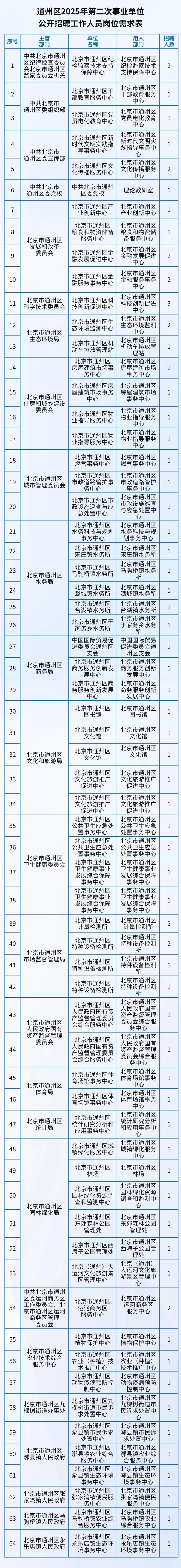 按照《北京市事业单位公开招聘工作人员实施办法》(京人社专技发〔2010〕102号)等文件精神,结合我区事业单位发展需要,现开展通州区2025年第二次事业单位公开招聘工作。